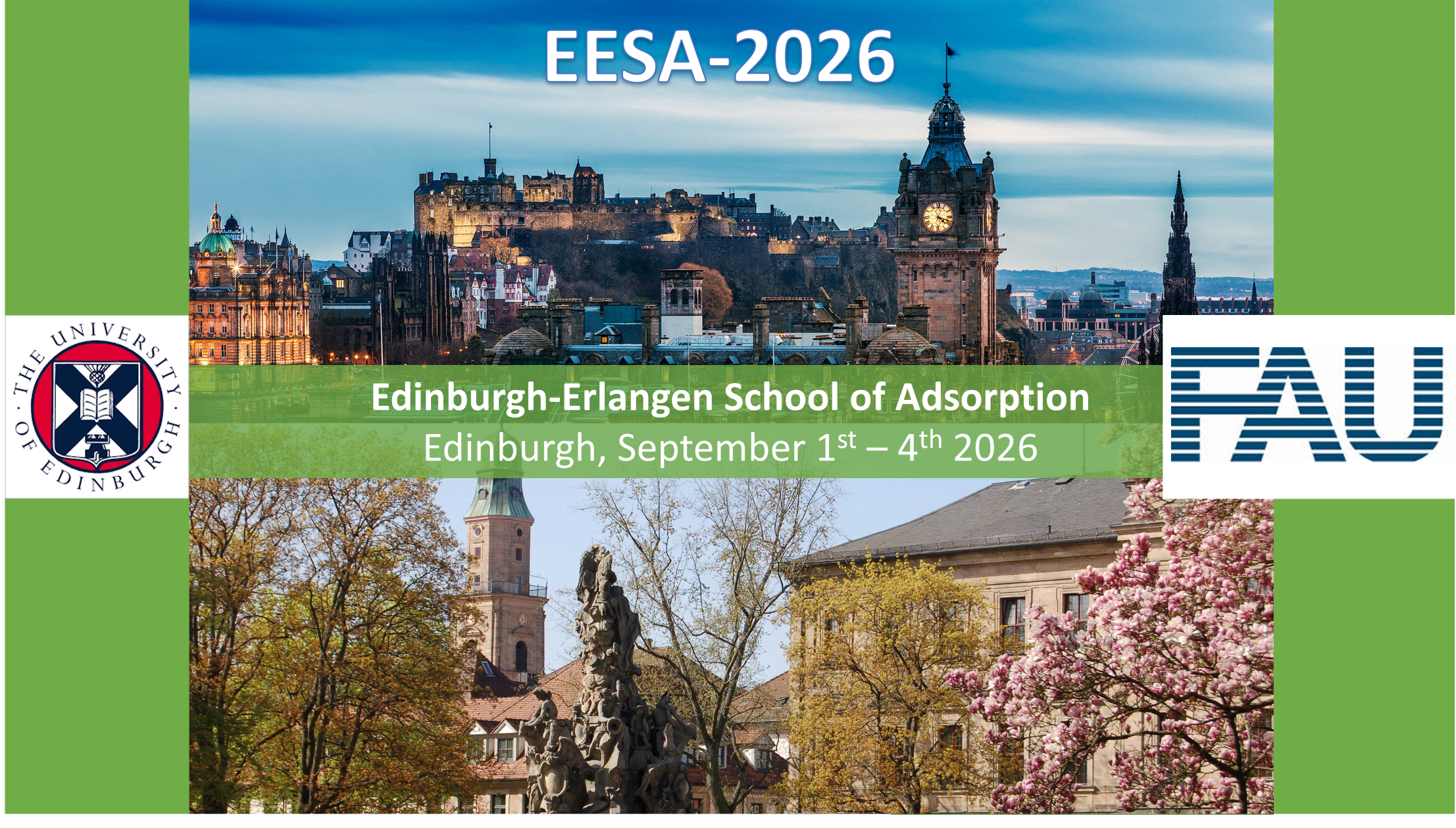 Prof. Stefano Brandani (University of Edinburgh) and Prof. Matthias Thommes (Friedrich-Alexander-University) are pleased to invite the International Adsorption Community to the Edinburgh-Erlangen School of Adsorption 2026, now in its 5th edition, which will take place in Edinburgh (UK) from September 1-4, 2026.